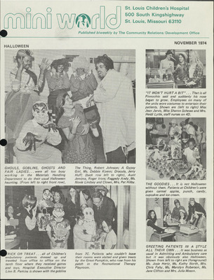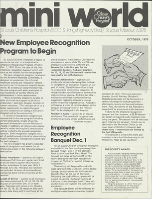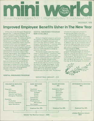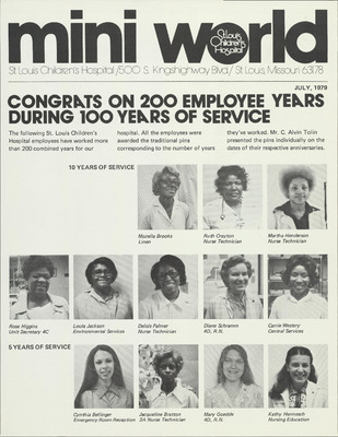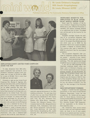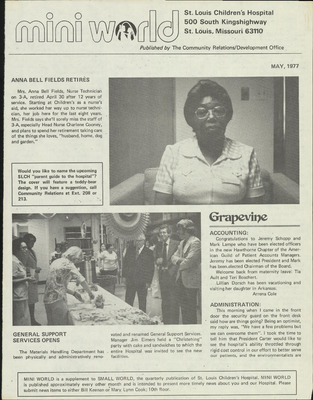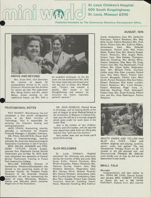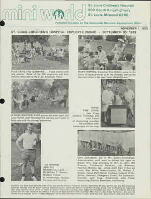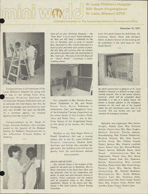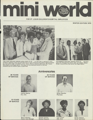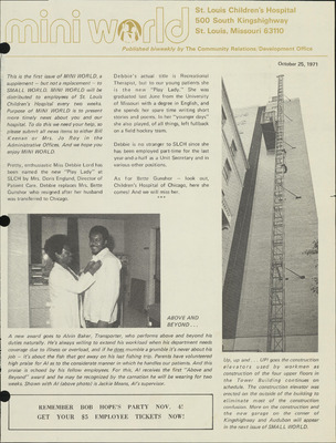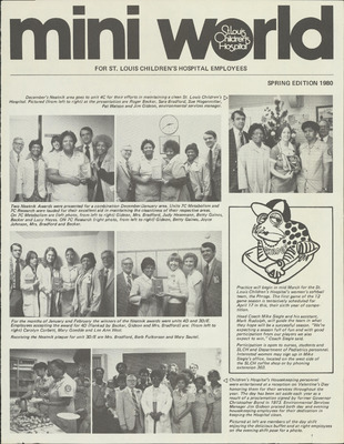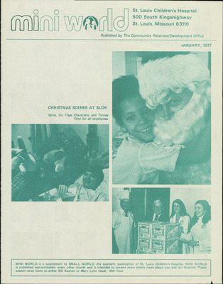 Mini World was published as a supplement to the employee publication, Our Small World by the Community Relations/Development Office of St. Louis Children’s Hospital. The biweekly publication was distributed to employees of St. Louis Children’s Hospital every two weeks. The stated “purpose” of Mini World was to present more timely news about employees and the hospital. The publication ran from approximately 1971-1980. Publications ranged from 2-6 pages.