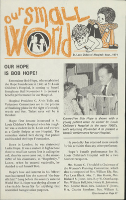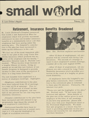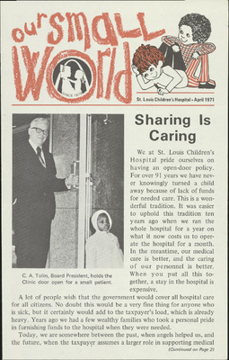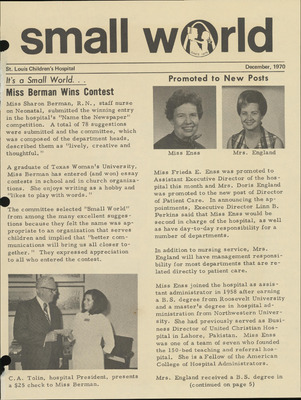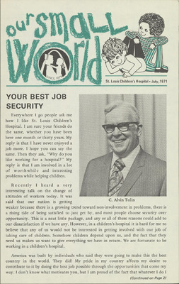 In a push to turn St. Louis Children’s Hospital into a “leading children’s hospital,” one of the goals the Board of Trustees set was improving internal communications. A quote from one of the first issues of Our Small World states, “If enough facts do not reach employees...if employees are not familiar with hospital policy or are getting their information through the grapevine, it means that management is not fast enough in informing employees about what we are thinking and planning to do. We are going to try to communicate better in 1971.”